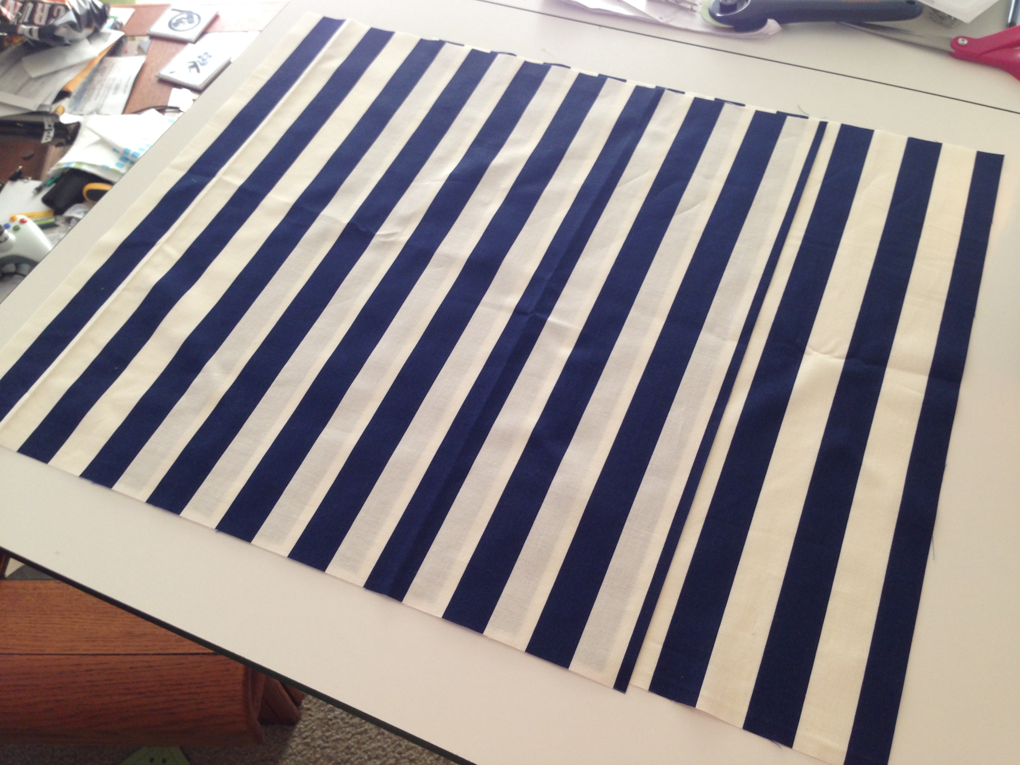 I ended up ordering two green prints because I wasn’t sure which I liked better. But once they arrived, I settled on the green circle pattern for three reasons: The shade of green better matched the other fabrics; the presence of more cream broke up the pattern; and the pattern just seemed more obvious. Though the yellow pattern wasn’t quite as bright of a yellow as I had hoped for, it’s still a fun, geometric pattern , which I was going for. The fifth, and final (at least for now), fabric I chose was also from Hawthorne Threads. It was a basic navy and cream (shocking!) striped pattern.