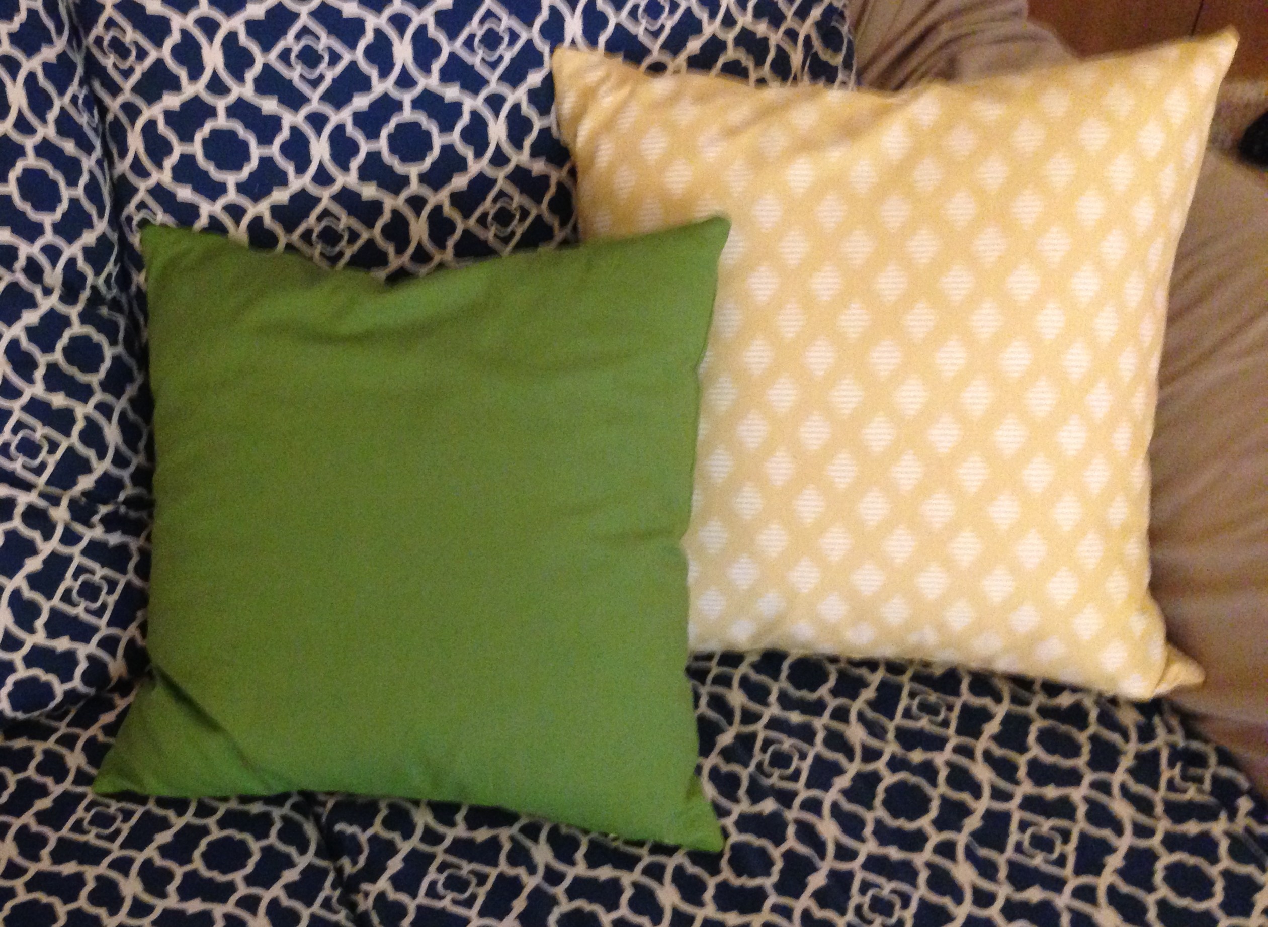 Last Christmas, I received 5 pillow forms as a gift. They remained tucked away in my “craft stash” until this summer when I finally got around to finding some fabric and making some fun pillow cases. I knew I wanted them to coordinate with my new(-ish) sofa cushions, but I wanted to bring in a couple of other fun colors, too. So I decided to look for fabrics with blues, greens, and/or yellows. The first two fabrics I found at Joann Fabrics.