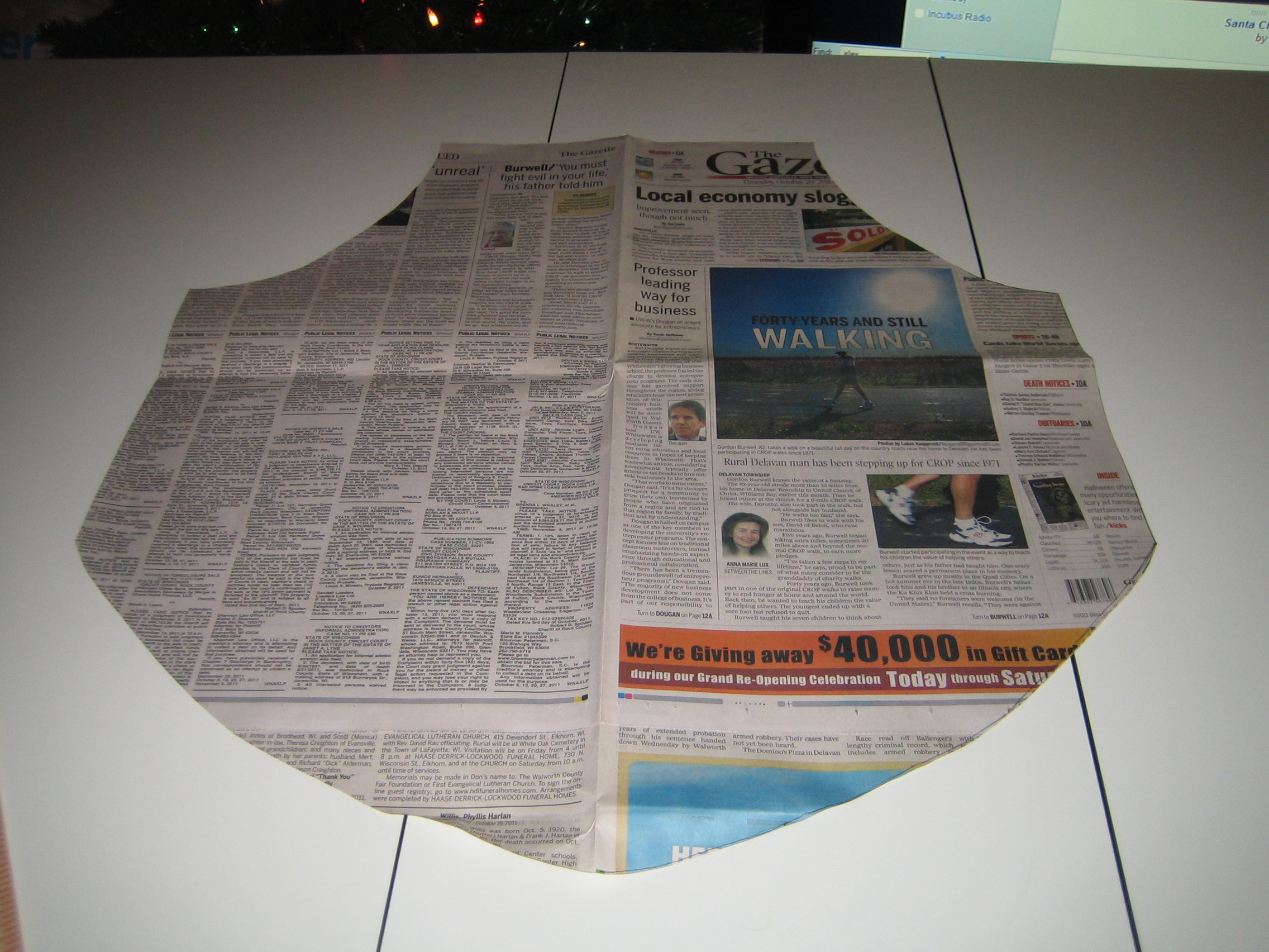 I started by creating a pattern out of some newspaper. The dimensions provided in the tutorial weren’t as thorough as I would have liked, but there was enough info that I was able to figure it out.