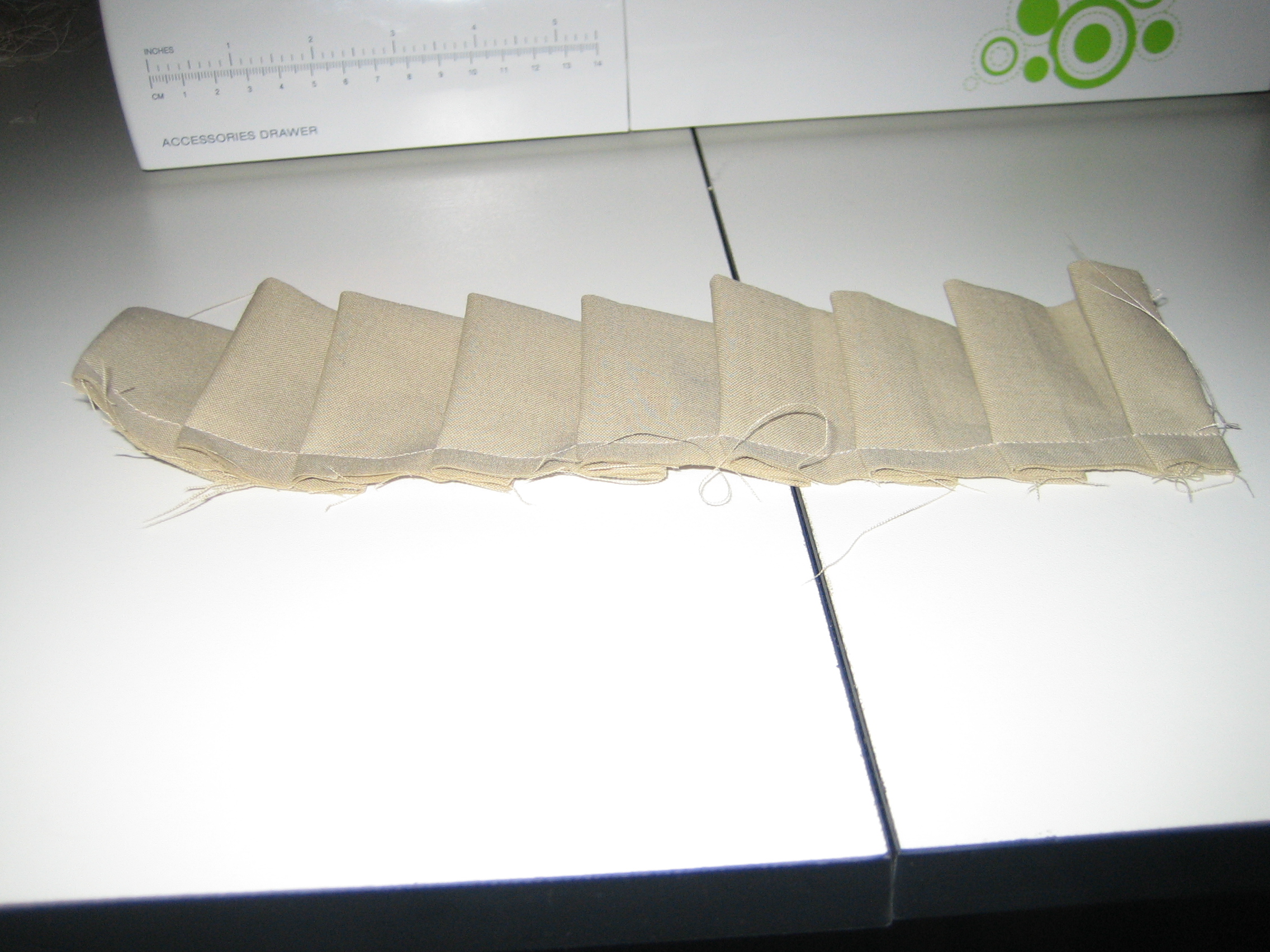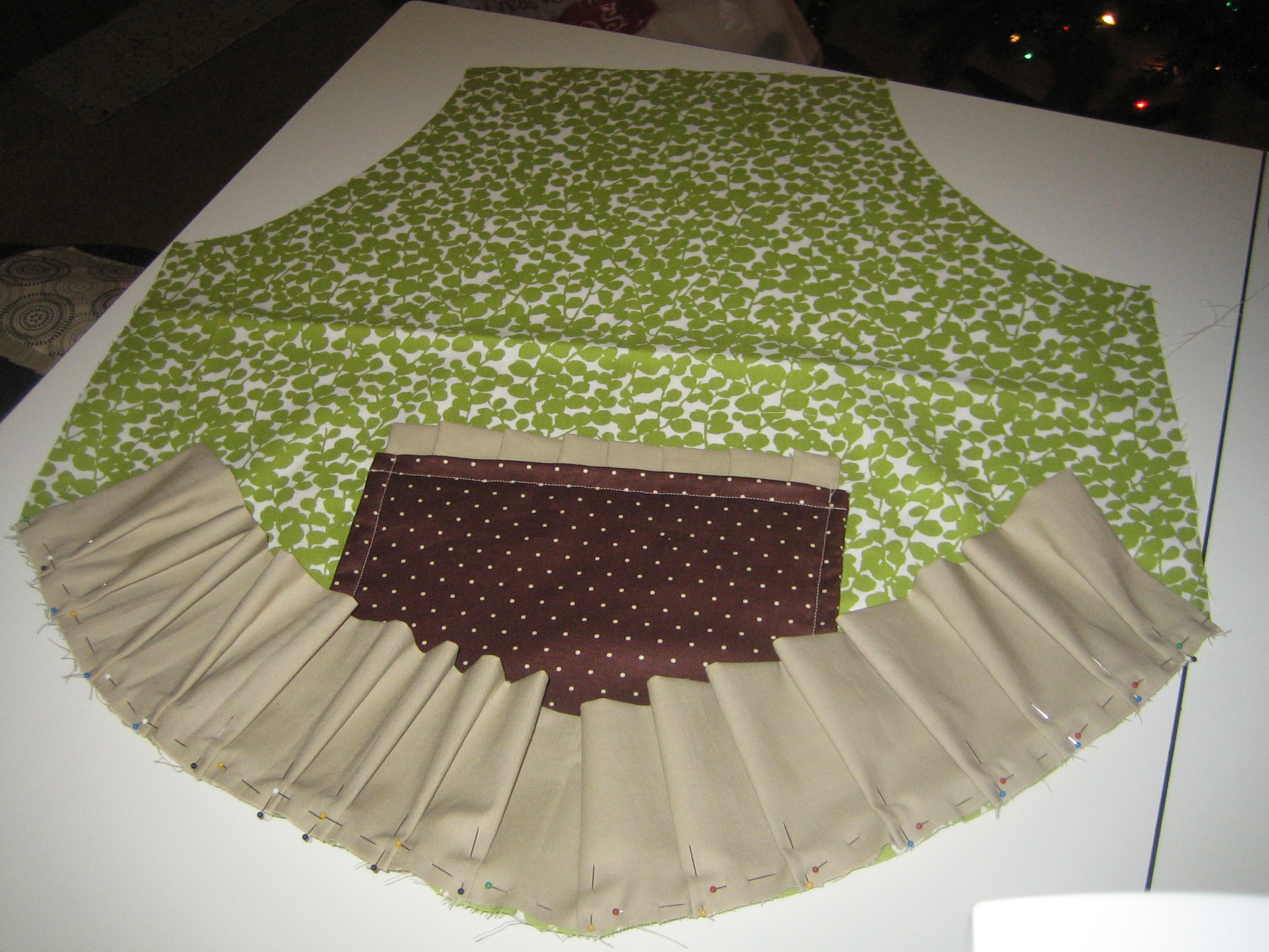 The pleated details at the pockets and bottom of the apron were a bit trickier. I remember having to fold the pleats at least three times to get the finished length to match the length of the bottom of the apron. I probably could have spent a little more time measuring and then calculating the difference between the unfinished and finished dimensions, but in the end, I got it to work. The curve at the bottom of the apron also made it a bit trickier.