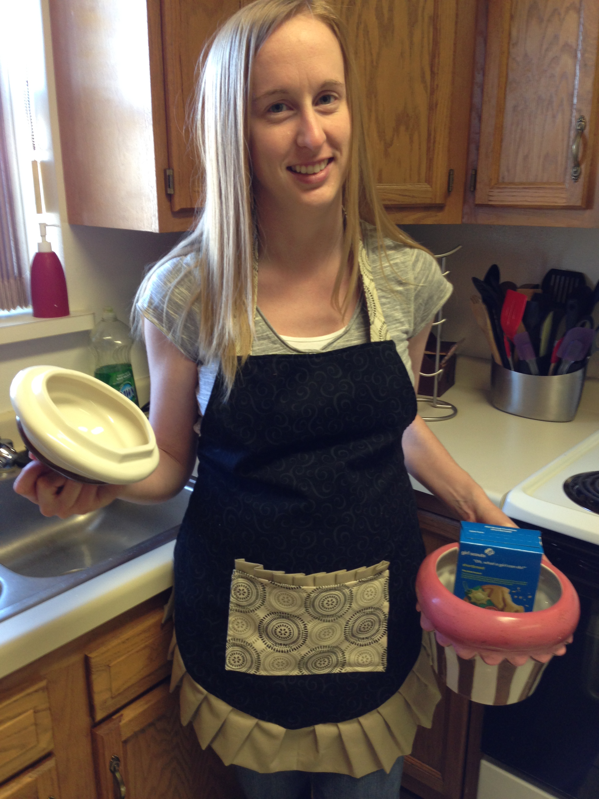 The end result: Two aprons that function for my <beginsarcasm>frequent</endsarcasm> cooking and baking needs. Note: the following pictures accurately display the amount of effort I usually apply to food preparation on a regular basis.